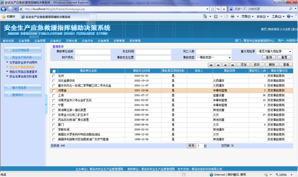 主要管理危險化學品安全技術說明書、安全生產事故案例、危險化學品應急速查手冊、安全法律法規及標準庫,安全法規庫管理安全應急相關的法律法規。