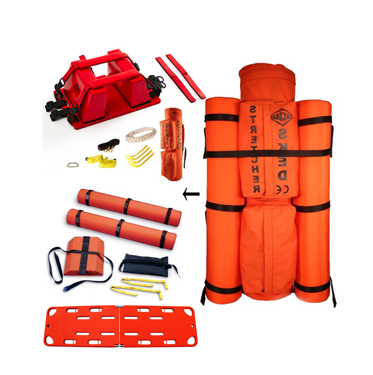 可漂浮救生擔架材質:柔韌塑料制成,強度高、耐磨性??捎糜谒婢仍蜕降鼐仍豢杉釉O固定扁帶,可防止拖拽造成損壞。高強度把手8個,工作負載:400kg,內置平板式可拆卸浮力輔助系統和脊柱板固定系統,方便固定傷員,配備:梅隴鎖1個(主軸拉力45kN、橫軸拉力8kN)、鋼制梨型鉤4個(主軸拉力36kN橫軸8kN)、垂直豎井提升繩1套、浮力輔助部件和脊柱板一套。擔架浮力:1.6kN。