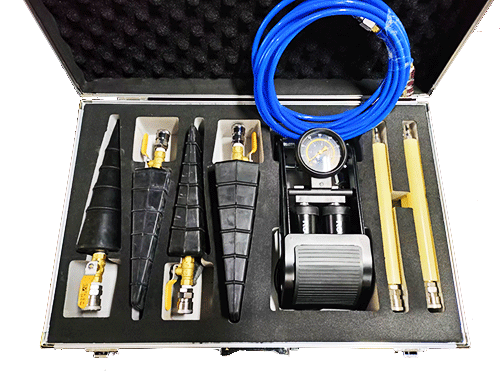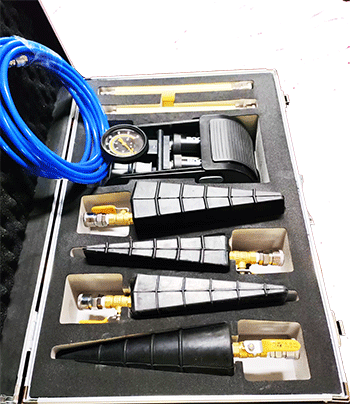 用于快速封堵背壓≦0.1Mpa,泄漏介質(zhì)溫度≦60℃的存儲(chǔ)罐、油罐車、液柜車裂縫,不需要拉伸帶。操作人員堵漏時(shí)將槍頭、槍桿、連接氣管、腳踏氣泵連接在一起,手持槍桿在安全距離外,將楔形或圓錐形密封袋插入于直徑15至60毫米的裂縫里面,以及直徑30至90毫米的漏孔內(nèi),并迅速充氣密封裂縫。