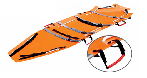 2擔架邊上設有多出的繩帶,便于實施空中救援。牢固的尼龍綁帶,有效固定傷員,卡扣設有可調節的大小。尼龍帶把手上設有塑料橡皮圈,不勒手。