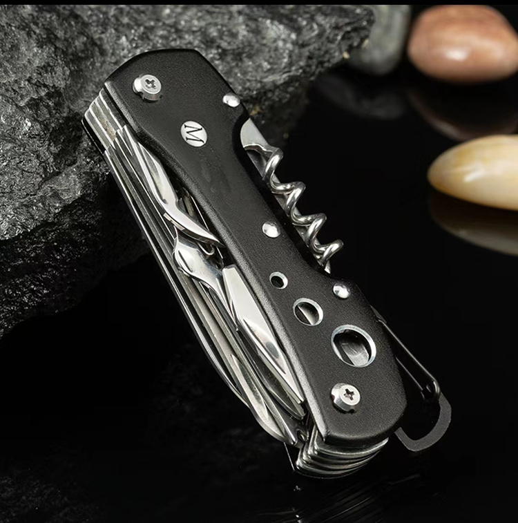多功能刀又常稱(chēng)為多功能戶(hù)外刀或萬(wàn)用刀,是含有許多工具在一個(gè)刀身上的折疊小刀。多功能刀的組合工具不僅表現(xiàn)在品種上,同時(shí)還在于巧妙的組合在同一種工具上,使有限的工具發(fā)揮更多的實(shí)功能。一把普通的多功能刀,一般都有主刀、小刀、剪刀、開(kāi)瓶器、木鋸、小改錐、拔木塞鉆、牙簽、小鑷子等工具。而在一些工具上還設(shè)計(jì)了多種功用。
