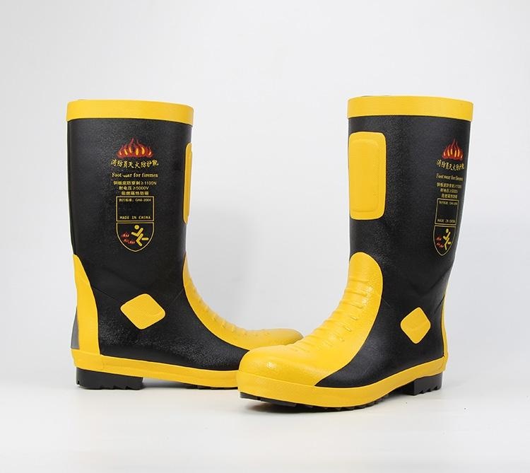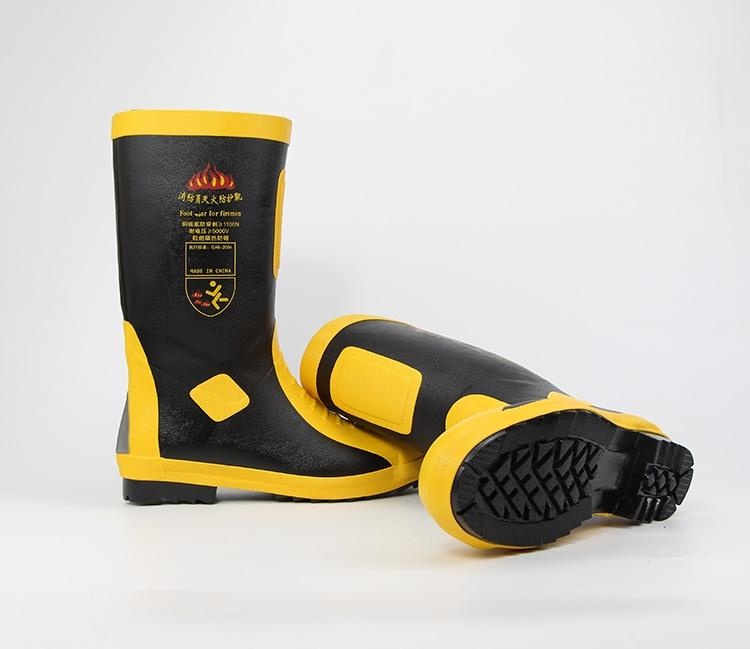 消防員滅火防護靴主要由大底和靴幫兩部分組成,主題顏色為黑色,配以黃色的圍條、沿條等。整靴均采用多層結構。