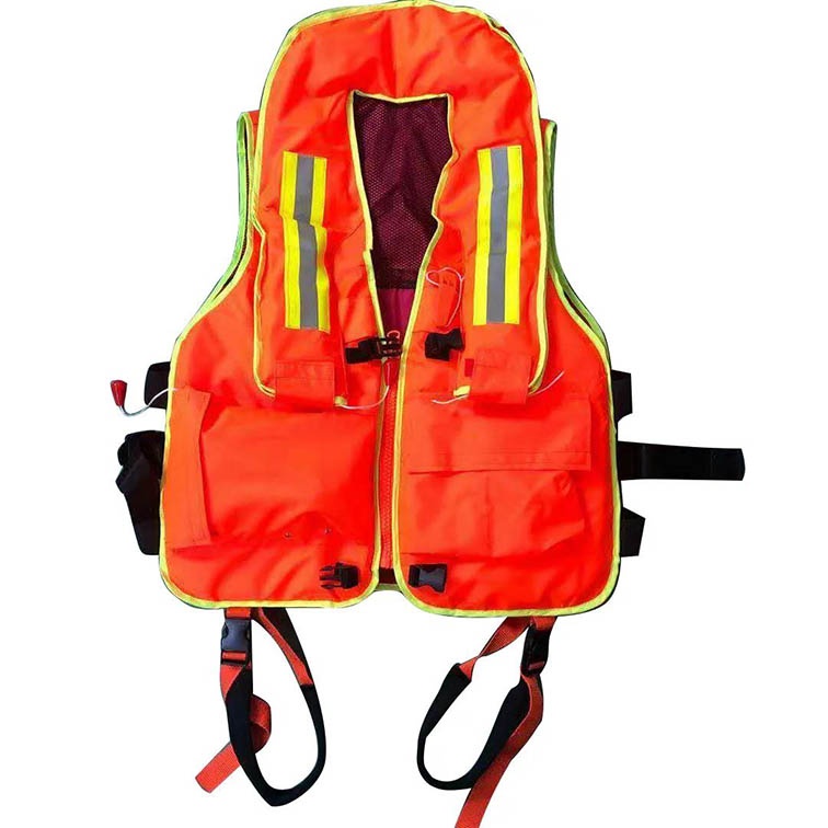 消防專用救生衣由背心式救生衣體、救生衣氣囊、氣脹式救生圈、輔件及屬具組成。背心式救生衣體由固有浮力材料及包布組成。救生衣輔件主要包括拉鏈、敷帶、反光帶、搭扣及掛環等,其中敷帶包括襠帶和收緊帶。