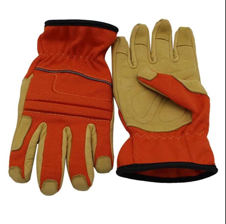 采用3D立體設計,符合人體手型自然彎曲,手掌指尖一片式翻轉手指背,主體顏色為橘紅色和黃色,主要材質為牛皮和芳綸雙面針織布,總體性能符合《GA633-2006消防員搶險救援服裝》的標準。