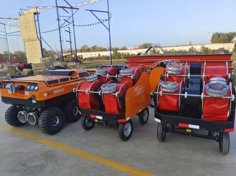 供排水機(jī)器人配有大口徑水帶收放車(chē),采用電動(dòng)快速鋪設(shè)系統(tǒng),操作簡(jiǎn)單,實(shí)用性強(qiáng)等特點(diǎn),解決了人力收放水帶的不便利性,增加了救援時(shí)間。