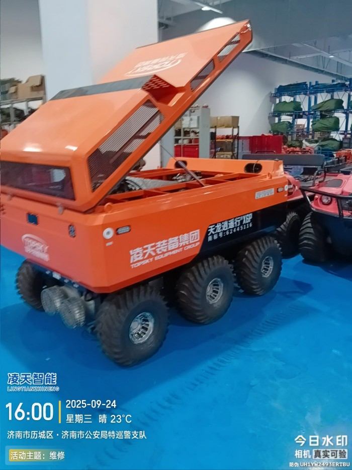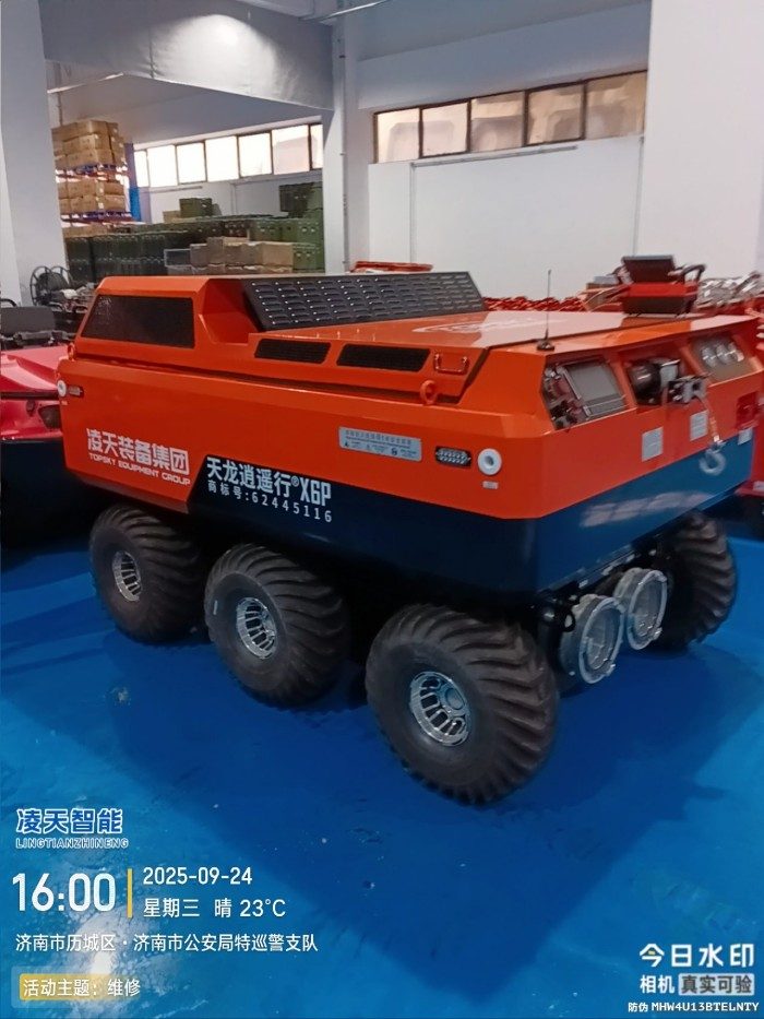 采用6×6輪式底盤,液壓驅動,裝有真空輪胎,另加配水下推進器,增加水中行進效率,水陸兩棲,可全地形行駛;