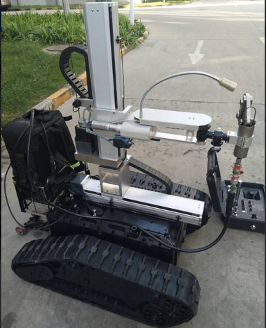 主要是用來處理戰術破拆式機器人,也可用于遠程遙控偵察人難以達到的地形的一種機器人。機器人配備十字滑臺,靈活調動工具的工作位置,可加載手持式切割機,還可以加載獨立電動液壓工具其包括:微型開門器、微型擴張器、微型剪切器之間可以靈活更換,底盤采用履帶結構,能適應各種地形快速作戰部署。 |