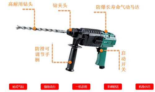 主要用于巖石,磚墻,混凝土等構件上鑿孔,作安裝管道、架設動力線路、安裝地腳螺栓、化工廠、精煉廠、建筑、重工業、危險潮濕的隧道、水下及狹窄的空間作業;尤其在高瓦斯防爆礦井中,氣動防爆無火花更能體現安全性。它是提高工效,減輕勞動強度的工具.