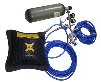 高壓氣瓶通過壓力調節器(減壓閥)的減壓,將25MPa的高壓空氣降低到0.8MPa低壓空氣,0.8MPa低壓空氣通過雙向控制器連接兩個氣墊或兩個氣囊,可完成兩組起重操作。控制器由雙向控制器和單向控制器兩種類型,顧名思義,雙向控制器可連接兩個氣墊或兩個氣囊,單向控制器可連接1個氣墊或1個氣囊。氣囊與氣墊的區別為,氣囊起重力小,起重高度高,氣墊剛好相反。