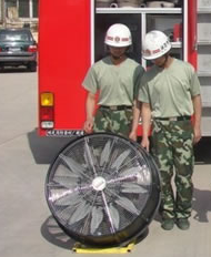 適用于有進風和出風的火場建筑物,利用排煙機的正壓把新鮮空氣通過建筑物進風口吹進建筑物內,把煙霧從建筑物內吹出,清除火場煙霧,使消防員能夠進入建筑物內的火場進行滅火。根據需要可以調節風扇的出風口的角度和風扇的轉速. 利用高壓水作動力,驅動水動機運轉,帶動風扇排煙, 具有防爆功能,重量輕,移動方便.