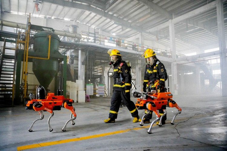 四足機器人搭載4D激光雷達,360°×90°半球超廣角感知能力,超低盲點,可以做出跳躍、伸展、握手、高興、跳人、坐下等手勢; 內置長續航電池,滿足消防偵察救援需求。