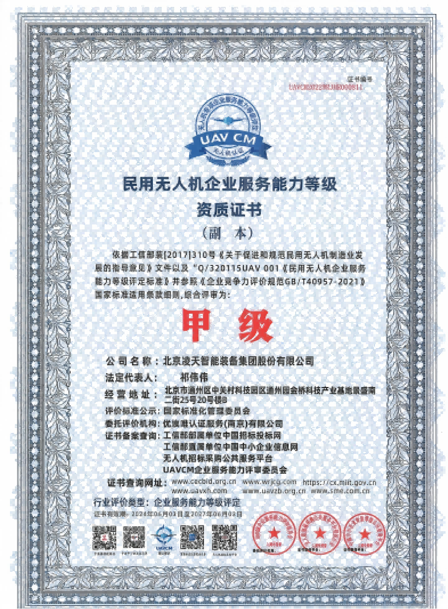 資格類 | 民用無人機企業(yè)服務能力等級資質證書(甲級) | |